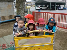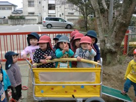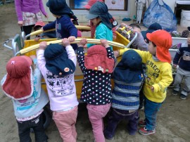 新・避難車 2013/02/12 保育園に、新しい避難車が来ました。 今日は、初試乗会の日。 子ども達は、とても大喜びで試乗会ができました。今日は、その模様をお伝えします。 避難車に乗って記念撮影 ひとりで乗り降りらっくらく。 避難車に乗って出発。 きちんと順番で、押したり乗ったりすることができました。 直美:記